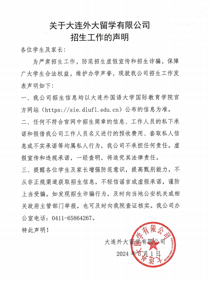 关于大连外大留学有限公司招生工作的声明